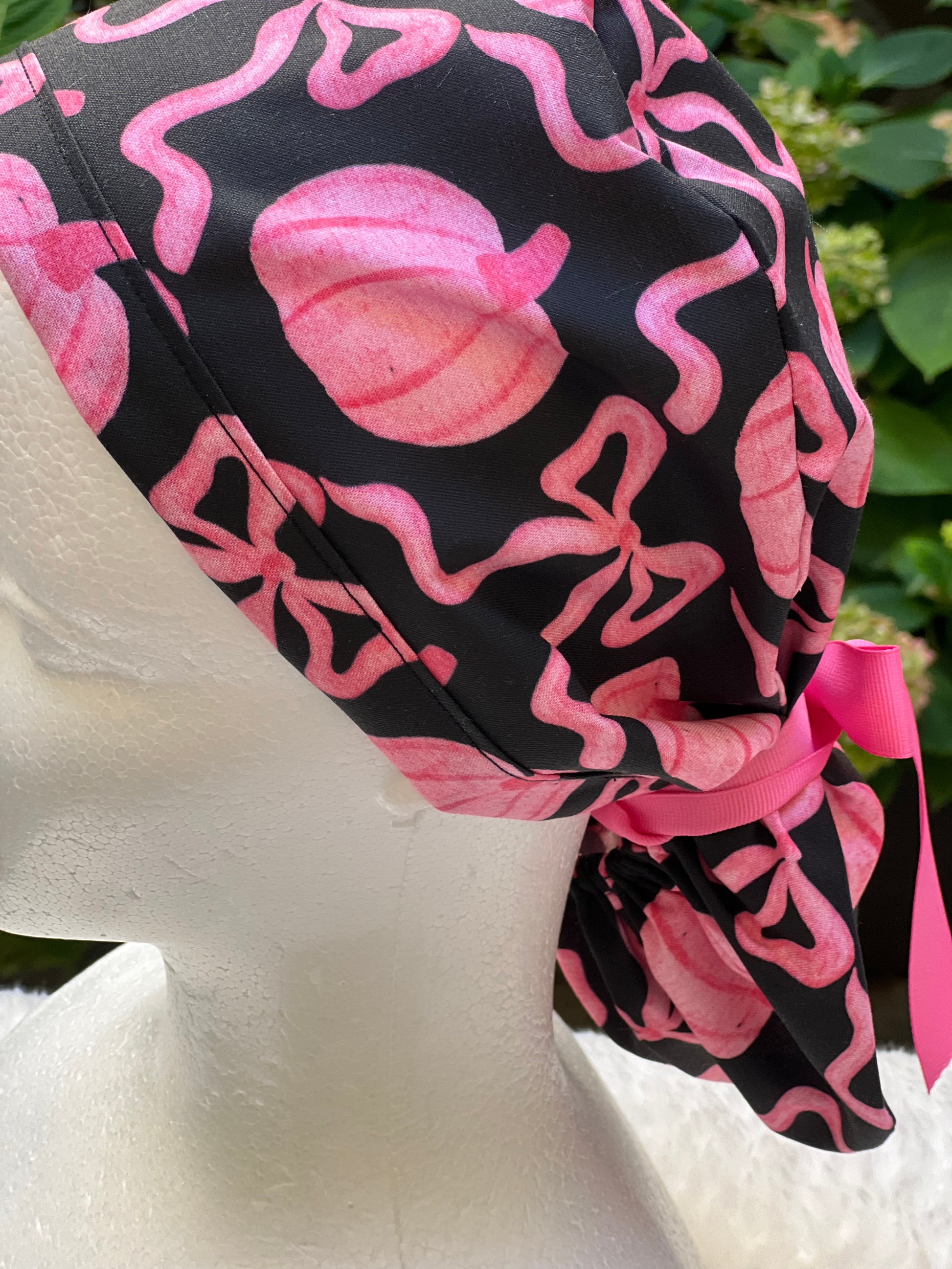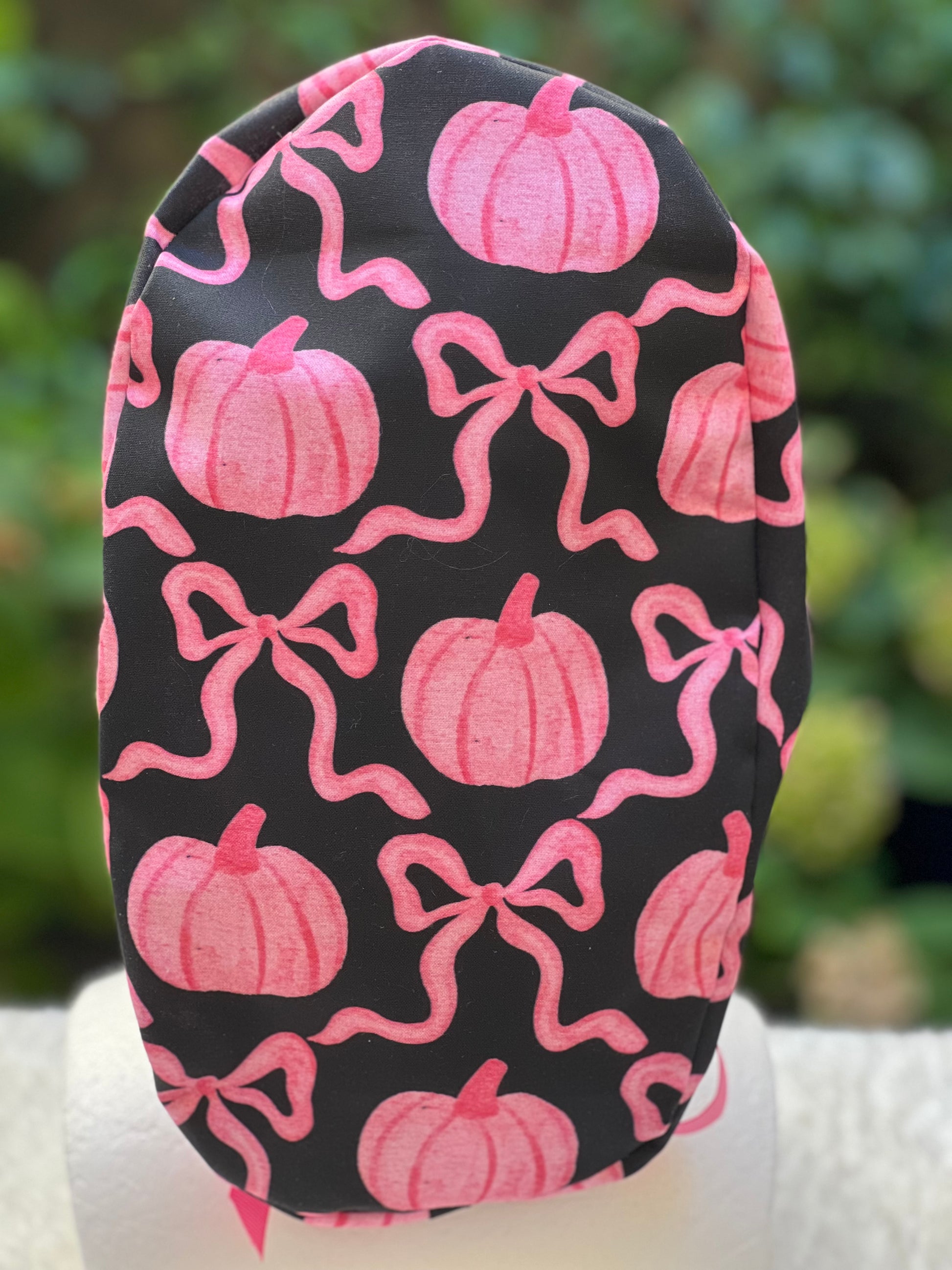 Black and Pink pumpkin with bow scrub cap