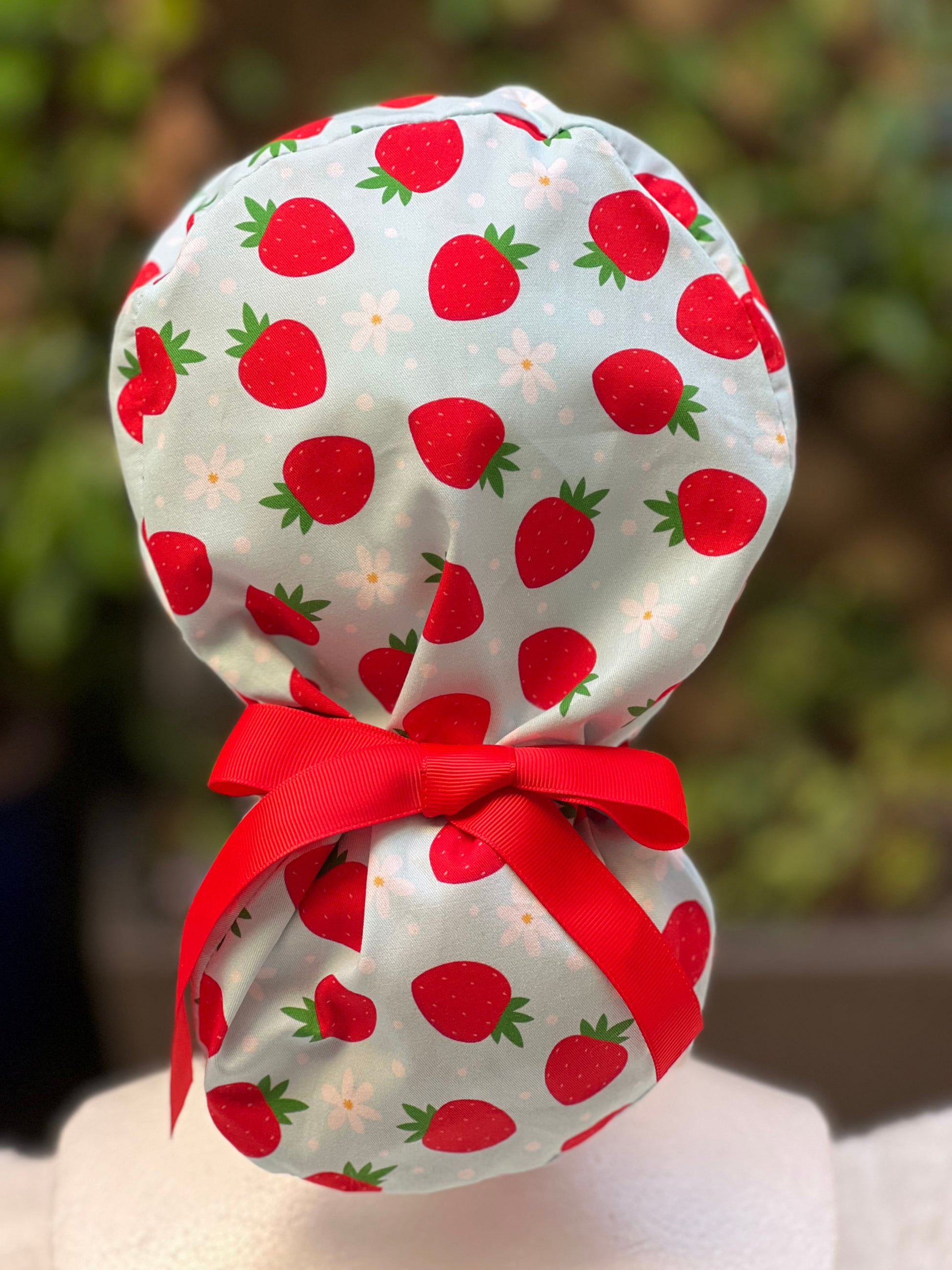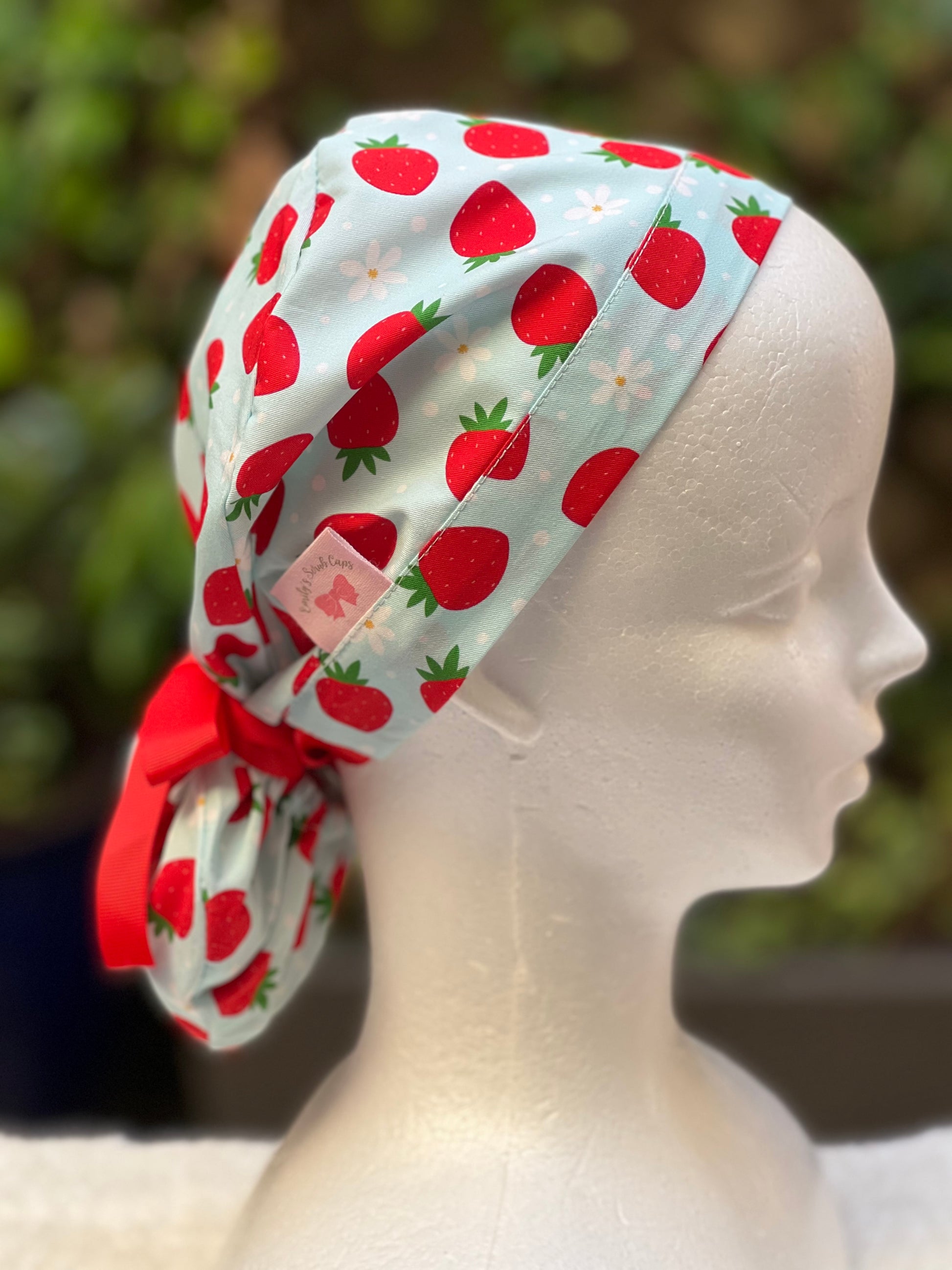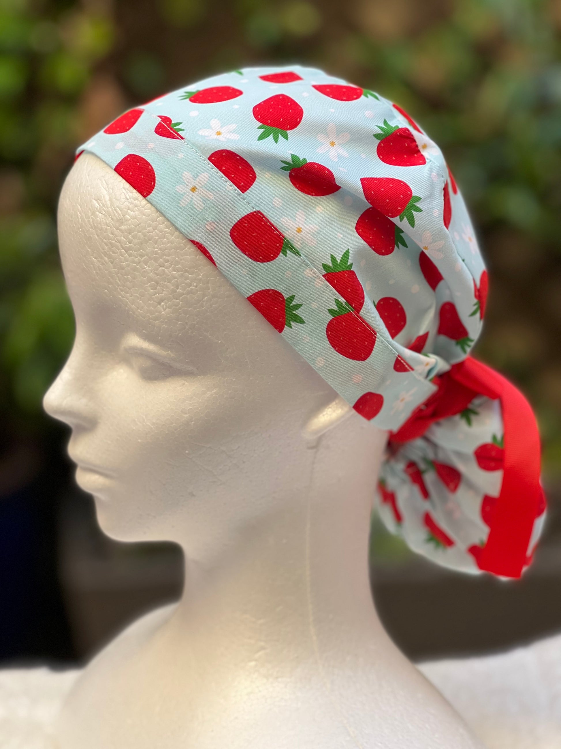 Green strawberry with daisies ponytail scrub cap