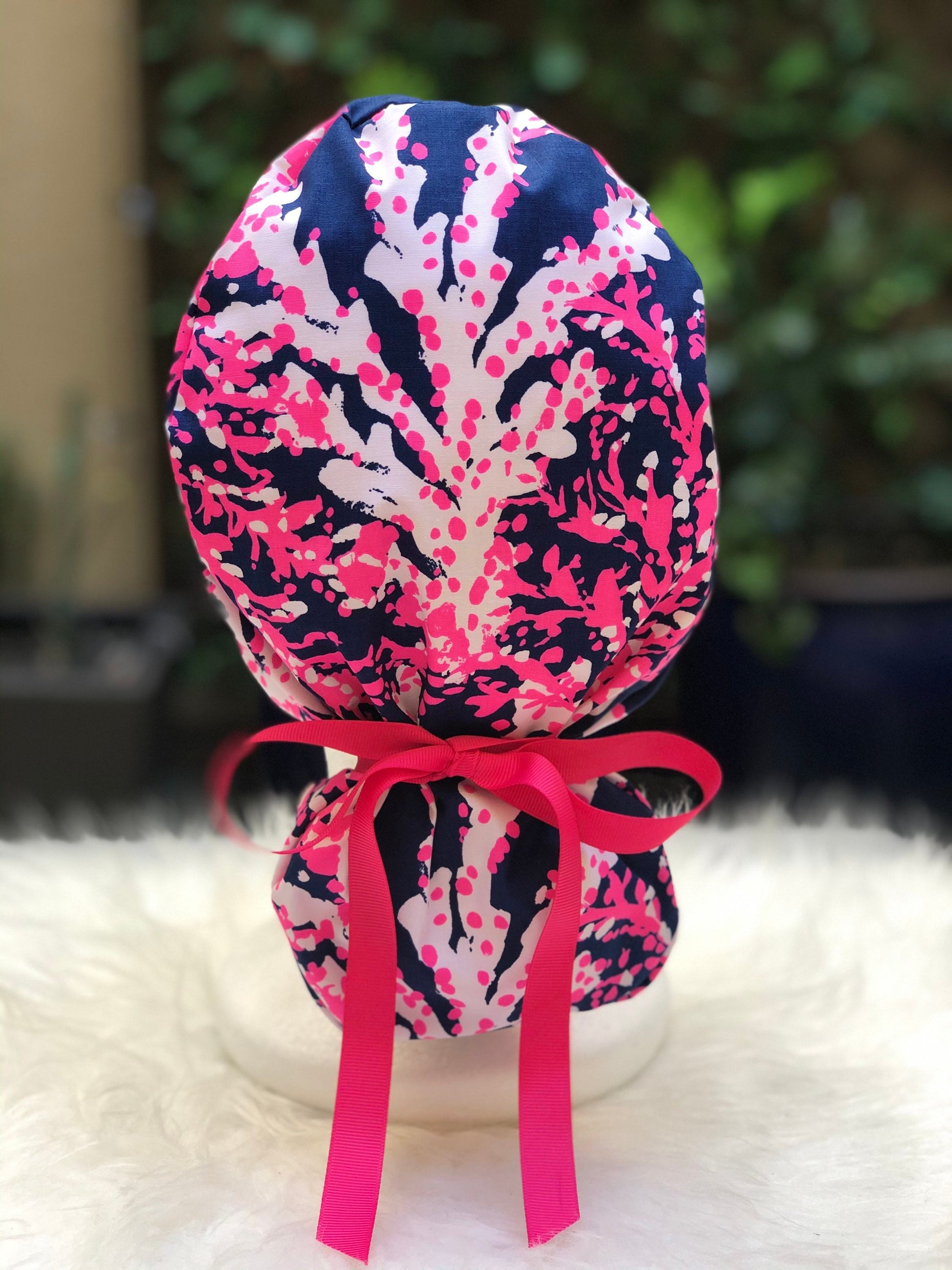 Ponytail style with ribbon tied over the cap or bouffant style with ribbon tied under the cap.